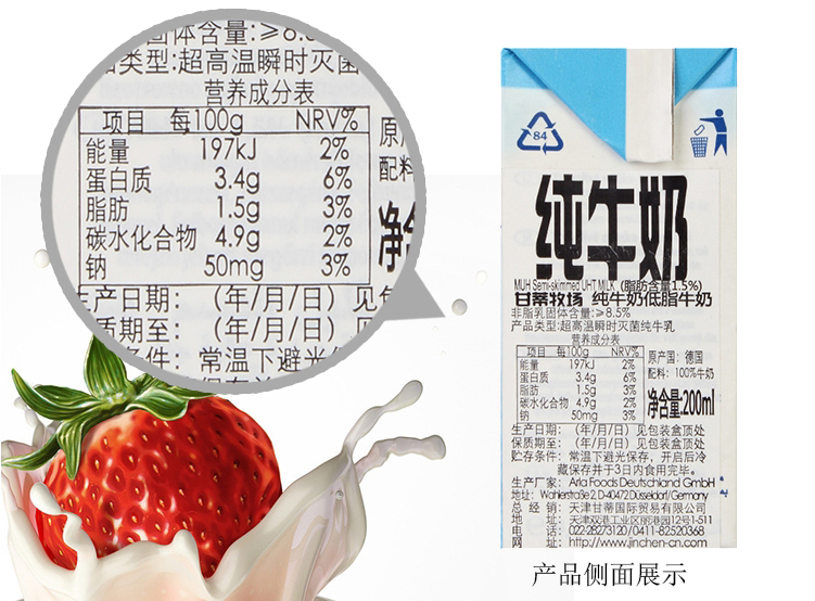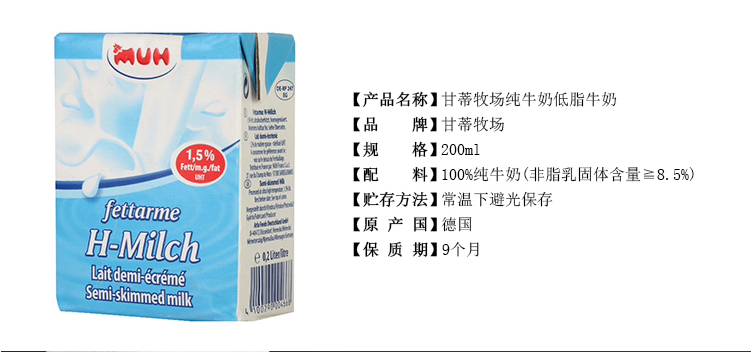 甘蒂牧場(chǎng)純牛奶低(dī)脂牛奶200ml 盒